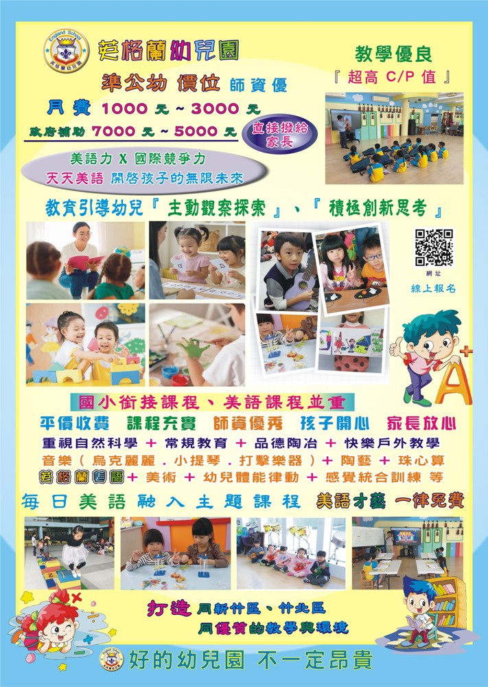 湖口幼兒園學費:湖口英格蘭幼兒園學費,以『 準公幼 價位 』、『 溫馨、安全、有愛的教育與環境 』、『 教室寬廣 教學優良 環境優美 活動空間大 』,與您共同打造一個同新竹區、竹北區,同優質的教育與環境。